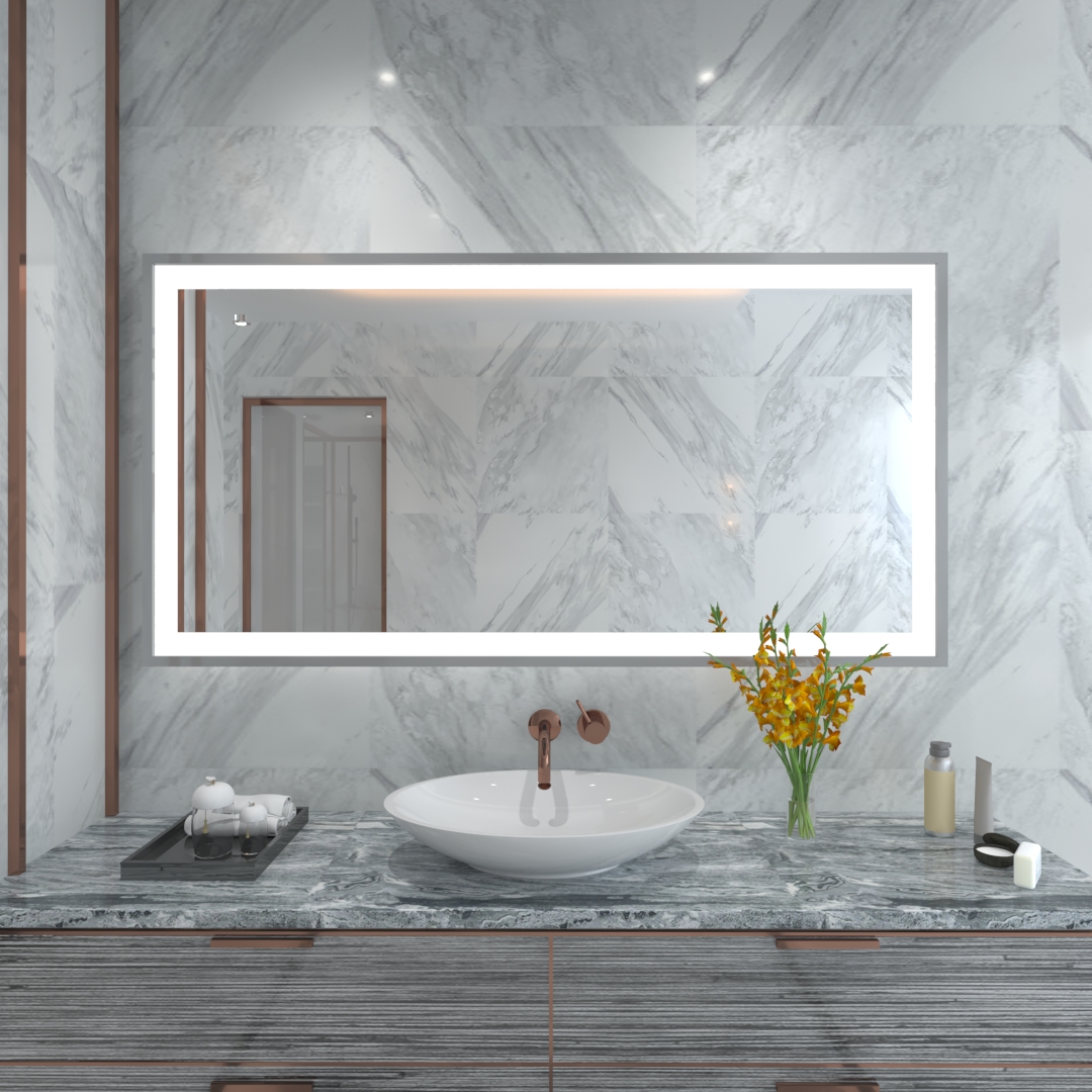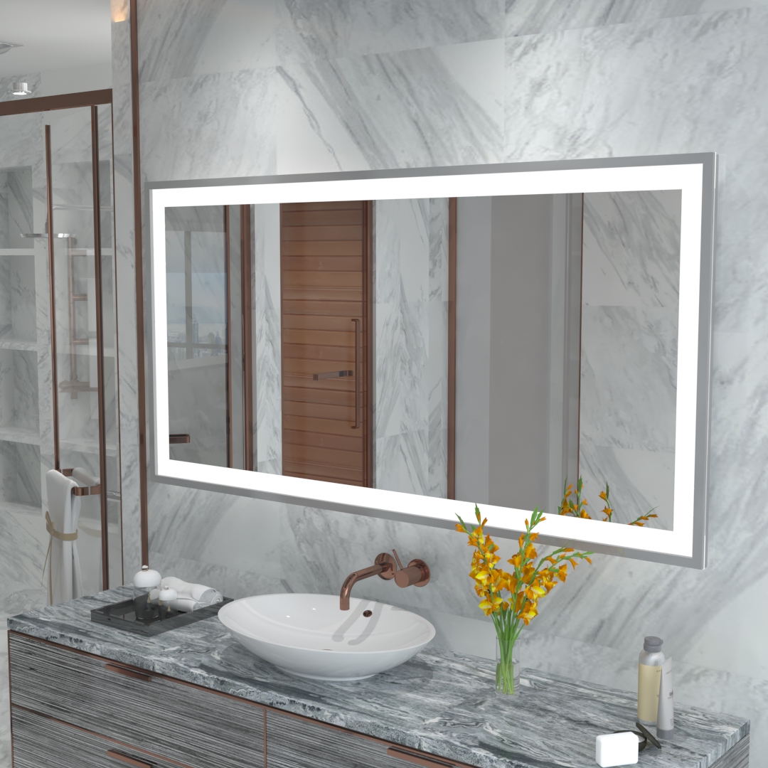 Dieser schicke Lichtspiegel mit Rundumbeleuchtung verfügt über eine etwa 4 cm breite lichtdurchlässige Satinierung entlang der Kanten. Er wird nach Ihren Wünschen gefertigt und zweifelsfrei ein wahres Juwel in Ihrem Bad sein. Für ein angenehmes Licht sorgen stromsparende LED-Bänder mit warmweißem, kaltweißem oder neutralweißem Licht, ganz nach Geschmack und Einrichtung des Bads.