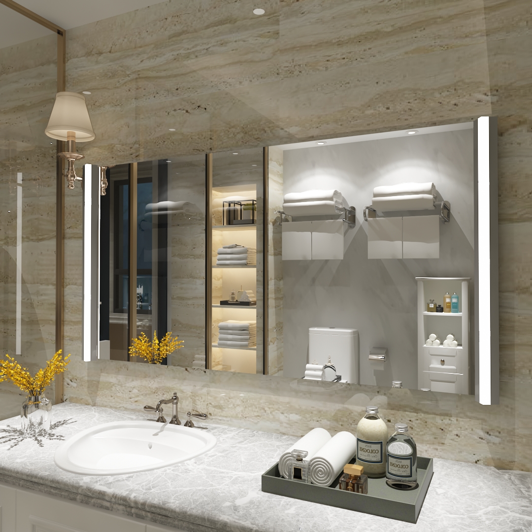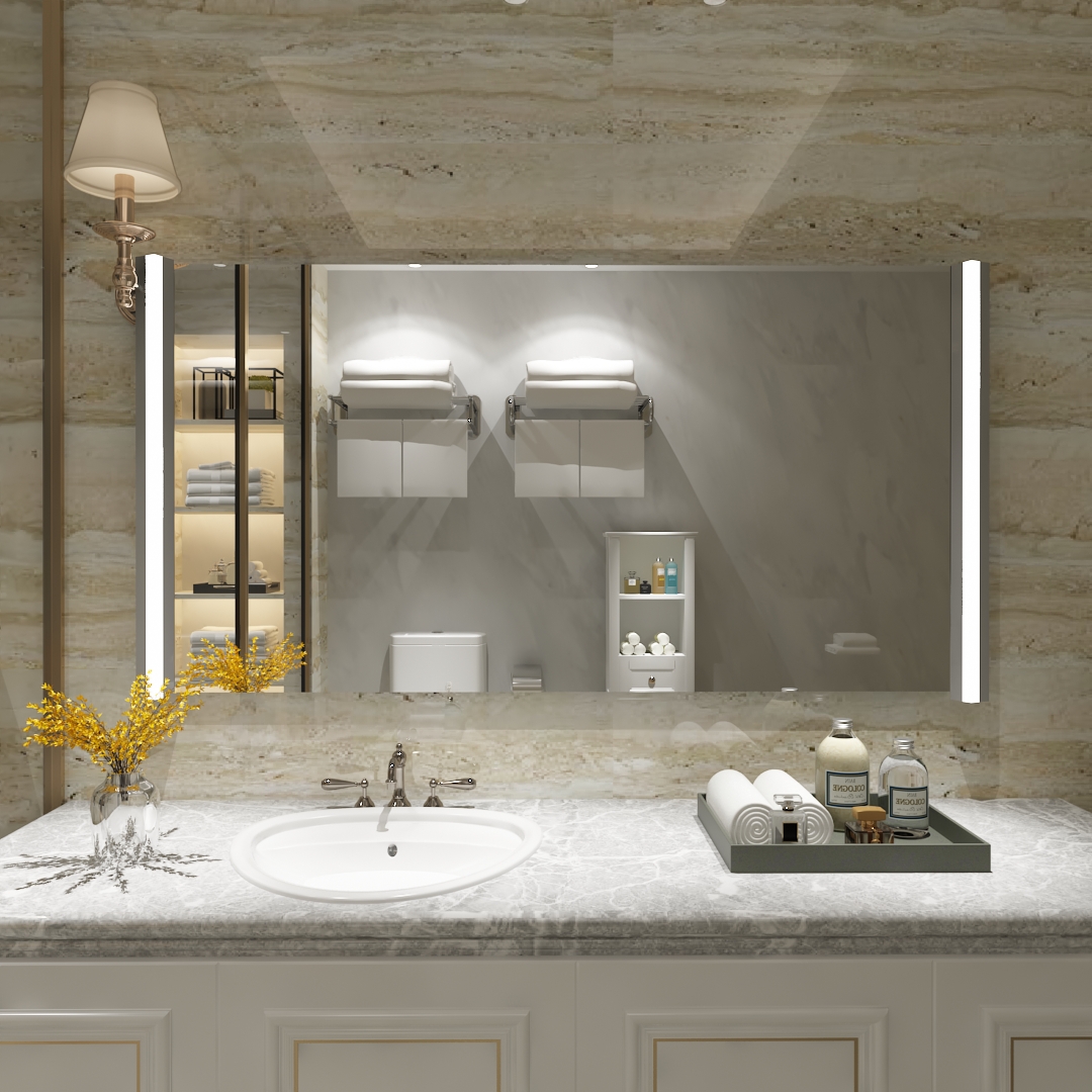 Komplex zeigt sich der Lichtspiegel Rheine 2, welcher über eine wohltuende Beleuchtung an den Seiten verfügt. Die stromsparenden LED verlaufen unter den formschönen Aluminium-Design-Profilen. Jene sind auf der Spiegeloberfläche befestigt und leicht abgeschrägt. Die lichtdurchlässigen Blenden sorgen für das wahre Highlight des Spiegels, sodass Sie auch bei schlechten Lichtverhältnissen alles im Blick behalten. Natürlich haben Sie die Möglichkeit, den Rheine-2-Spiegel individuell zu erweitern. Die Tiefe des Spiegels beläuft sich auf insgesamt 56 mm.